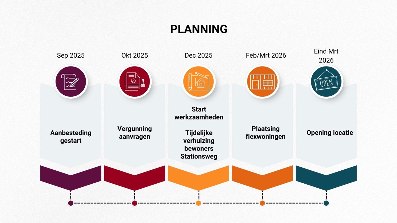 Op dit moment is de gemeente bezig met de aanbestedingsprocedure voor het leveren van de flexwoningen, het voorbereiden van benodigde grondwerkzaamheden en vergunningsprocedures. Als de omgevingsvergunning is verleend, kan de gegunde partij overgaan tot het plaatsen van de units.